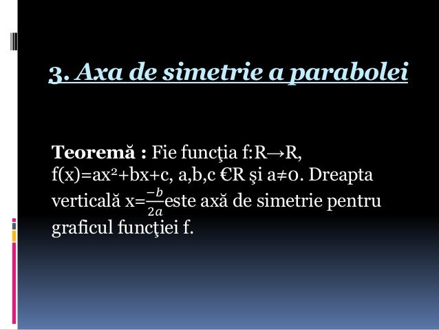 2.axa de simetrie a unei parabole este dreapta de ecuatie stiind din ipoteza ca axa de simetrie a parabolei este x=2 obtinem ca: Dreapta verticală este axă de simetrie pentru graficul funcţiei. Se rezolvă ecuaţia ataşată, ax2+bx+c=0;