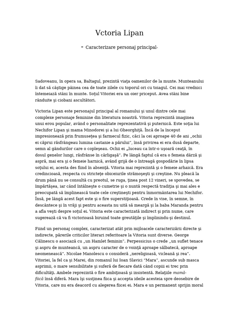 Sadoveanu romanul „baltagul rămâne o scriere memorabilă nu numai prin conţinutul şi multitudinea semnificaţiilor sale, ci şi prin personajele sale, între car. Read caracterizarea vitoriei lipan from the story comentarii română bac by secretaccount54 with 3,127 reads. Printre acestea se numara si vitoria lipan, nechifor lipan si gheorghita, feciorul lor.