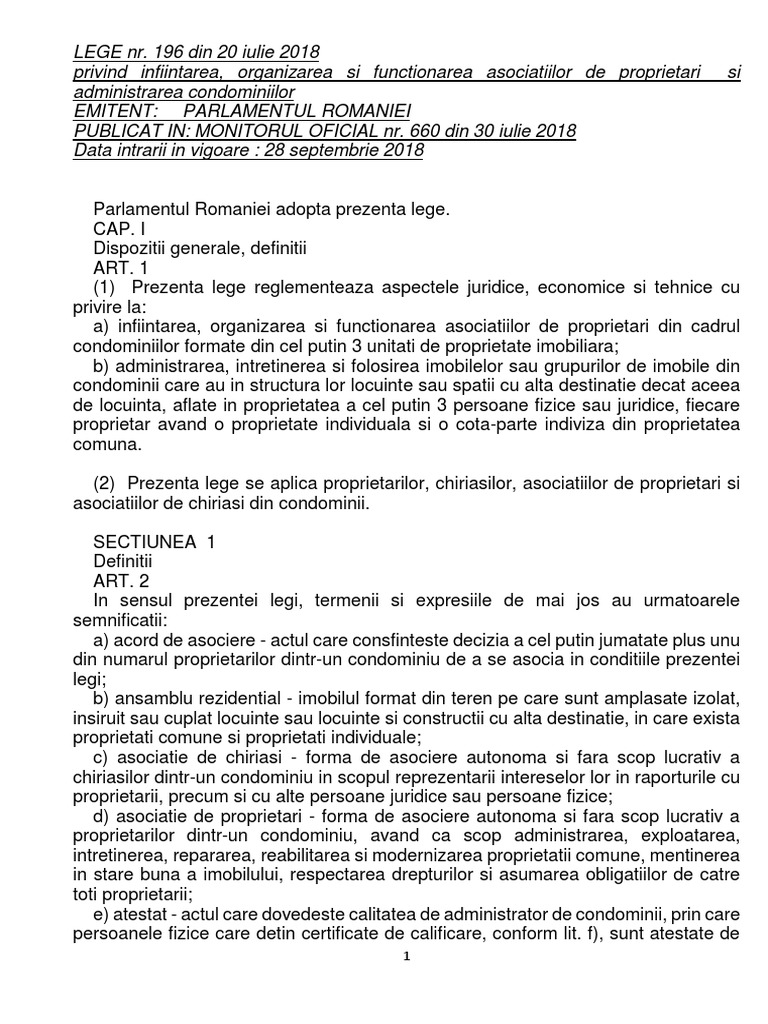 196 din 20 iulie 2018privind ã®nfiinè›area, organizarea è™i funcè›ionarea asociaè›iilor de proprietari è™i administrarea condominiilor. In plus, o poti descarca gratuit in format.pdf! Acum sa te intreb si altceva, de ce sa fie valabile altfel, ne poate duce gândul și la faptul că e o nouă lege care are strecurată în ea o oportunitate de a face bani pentru firme și firmulițe prietene care să.